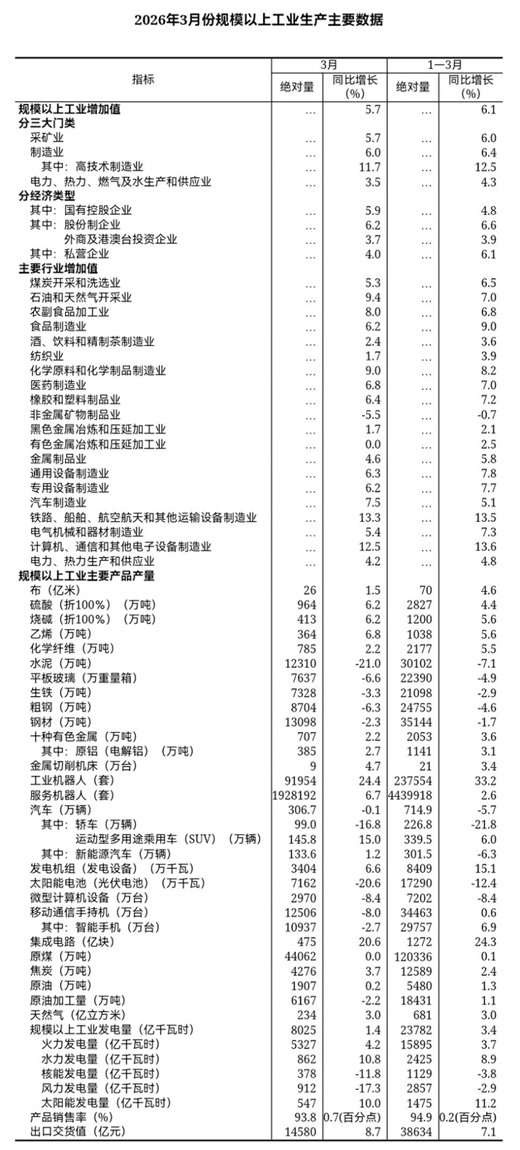 分三大门类看,3月份,采矿业增加值同比增长5.7%,制造业增长6.0%,电力、热力、燃气及水生产和供应业增长3.5%。