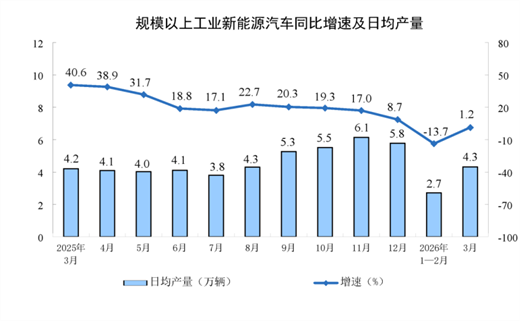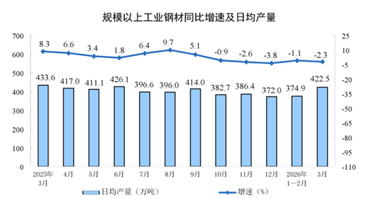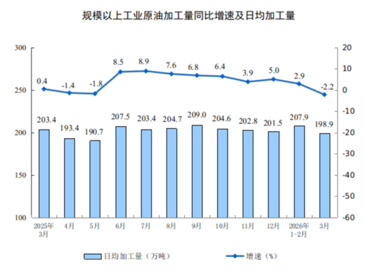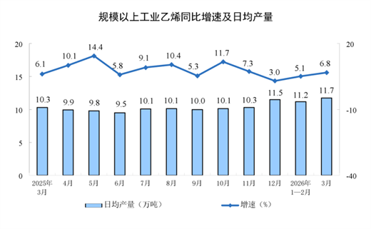 分产品看,3月份,规模以上工业626种产品中有329种产品产量同比增长。其中,钢材13098万吨,同比下降2.3%;水泥12310万吨,下降21.0%;十种有色金属707万吨,增长2.2%;乙烯364万吨,增长6.8%;汽车306.7万辆,下降0.1%,其中新能源汽车133.6万辆,增长1.2%;发电量8025亿千瓦时,增长1.4%;原油加工量6167万吨,下降2.2%。