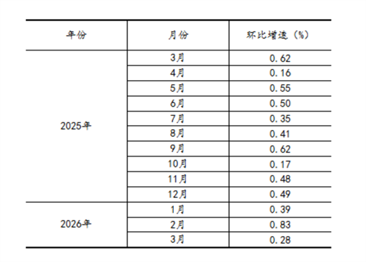 根据季节调整模型自动修正结果,对2025年3月份至2026年2月份规模以上工业增加值环比增速进行修订。修订结果及2026年3月份环比数据如下: